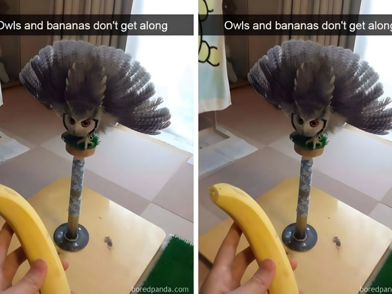Likely Device: Sharp Edge+ Buy At: Amazon, Motorola Average Price: $700* Owls project wisdom yet they are stealth hunters with few threats. Here humor wins: the owl puffs up as if a harmless banana were a rival. Even apex predators can have theatrical moments that ruffle feathers.