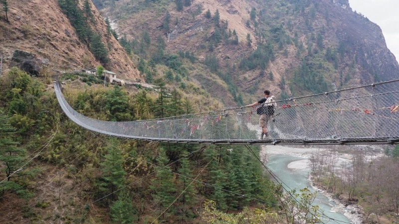 This narrow Nepalese crossing sways over a steep gorge as people and livestock share the route. The rhythm of hooves on planks underscores its daily importance and injects a hint of tension into each passage.