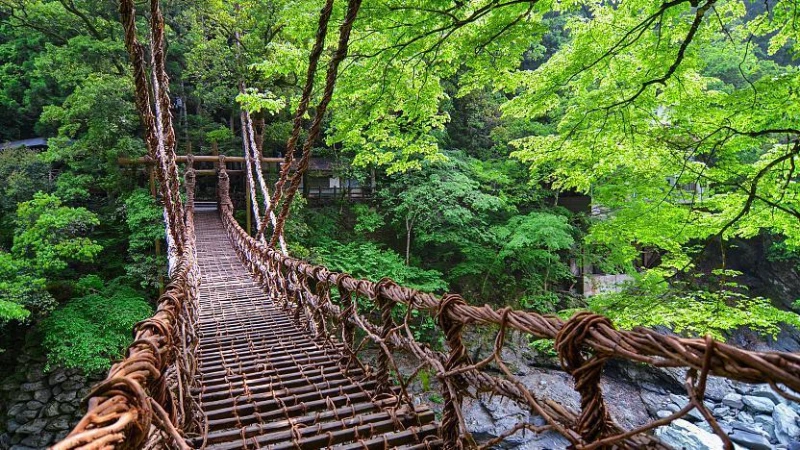 Set deep in the Iya Valley this vine woven span recalls centuries old travel. The creak of tendrils and gaps between slats heighten awareness of the river below. Reinforcing cables offer reassurance yet the crossing retains an authentic rustic tension.