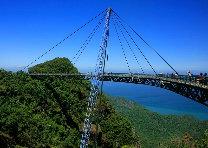 Floating above rainforest slopes the curving Langkawi Sky Bridge rests on a single support and radiating cables. Reaching it by inclined elevator sets the tone for the sweeping overlook where tropical peaks, open air and altitude fuel exhilaration and mild unease.