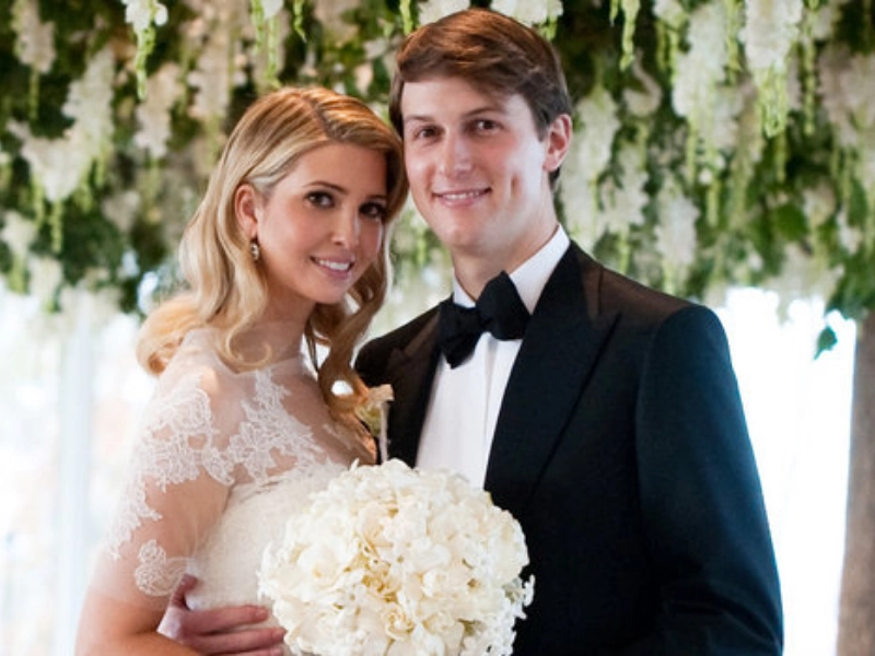 Ivanka Trump chose a Vera Wang gown with refined detailing and a sculpted outline. Expert workmanship and poised shape produced a radiant classic image.