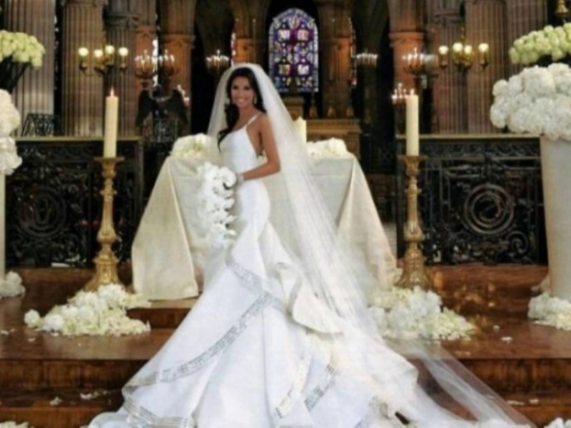 Eva Longoria chose an Angel Sanchez design in sumptuous organza and silk. Fluid lines and meticulous workmanship created a study in polished elegance, inspiring brides seeking poise with a modern note.