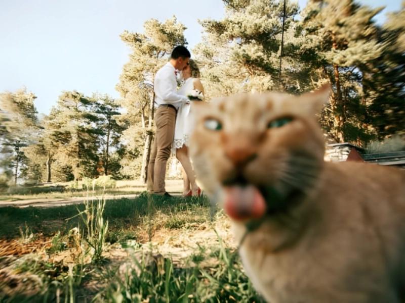 Some couples love camera cuddles; this cat clearly does not approve. Maybe her personal zone was breached. Cats crave focus, and these furry gate crashers will do anything to redirect it, turning poised portraits into comic mishaps.