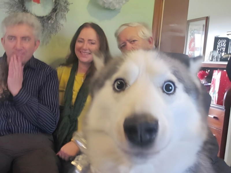 This dog leans in grinning for the family frame, eager to belong. His pop in makes the picture. Who could resist that face? His comic expressions seal the deal. Praise him and that smile will grow next time; dogs elevate every family photo.