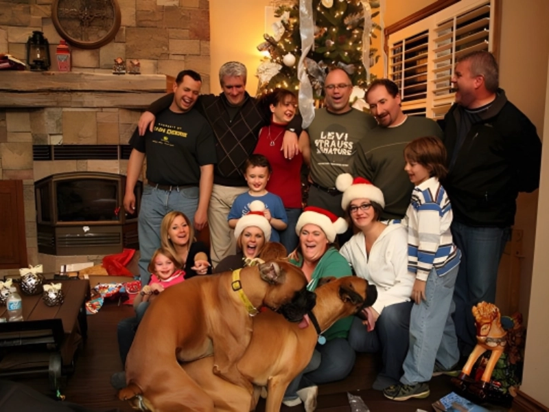An awkward holiday pose turns wilder when two dogs express extra Christmas cheer. Perhaps they opened gifts early. No one stopped them; the laughter is genuine. Sometimes you just ride the festive chaos.