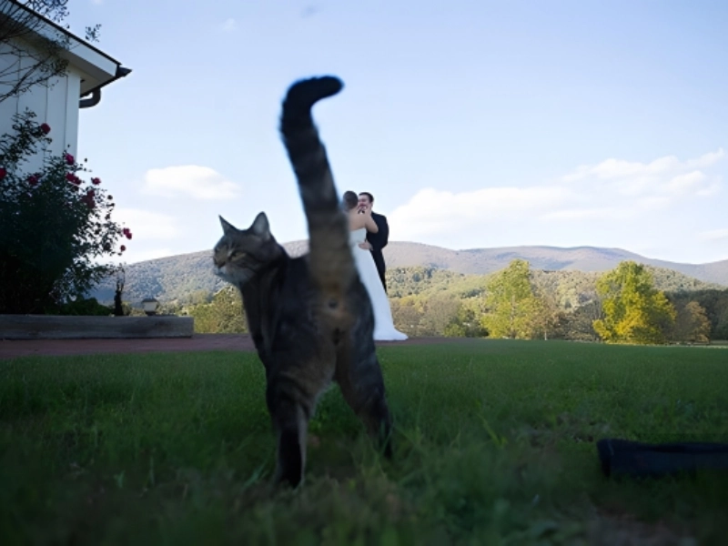 A cheeky interruption. Cats flaunt tails to trusted people. Here she seems to comment on the ceremony, adding her own blessing. Their bold spontaneity is why we love them.