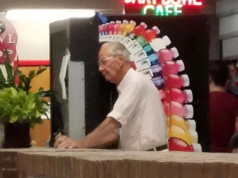 Store freezers act not only as chillers but also as playful branding stages. They create lively backdrops for candid shots merging humor and product. One memorable image shows an older man posing as a tribal chief with a crown formed by bottles.