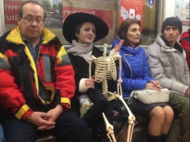Why hide skeletons when you can escort them? This playful commuter brought quirky companions, turning a standard trip into a whimsical vignette that delighted onlookers.