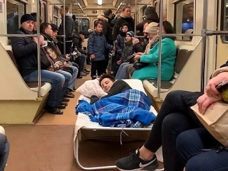 Sleep is prized, so riders seize stray moments. Stretched across seats or curled with a cushion, they show rest can be claimed anywhere, underscoring daily self care.